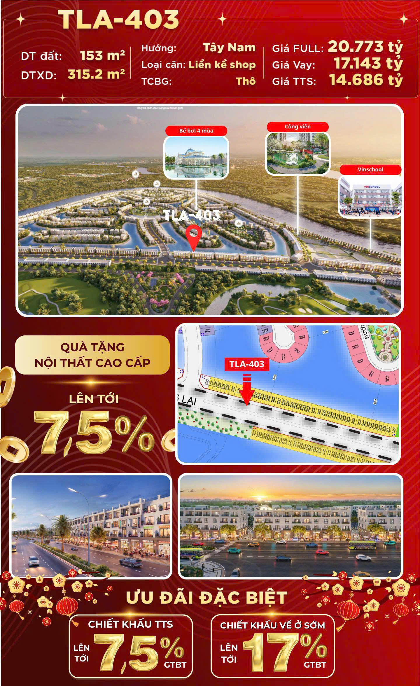 8.Căn Shophouse TLA-403, Shop xẻ khe ngay cổng Hoàng gia, có diện tích 153m3, view cực đẹp trước sau thoáng. GIÁ MỚI, CHÍNH SÁCH MỚI Tháng 2 giá chỉ còn hơn 13 tỷ