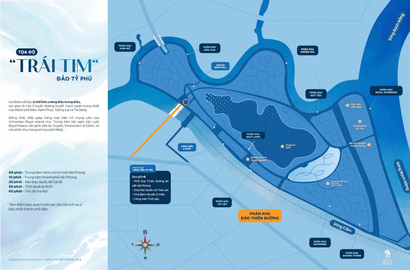Isla Bella tọa lạc trong quần thể đô thị đảo nghỉ dưỡng Vinhomes Royal Island, chỉ cách trung tâm Hà Nội hơn 1 giờ lái xe tạo ra lợi thế giao thông vượt trội cho cả cư dân và du khách. Với hệ thống đường vành đai, cao tốc, cầu vượt sông đồng bộ, việc di chuyển từ các tỉnh thành phía Bắc như Thủ đô Hà Nội, Hải Phòng, Hưng Yên, Hải Dương, Bắc Ninh hay Quảng Ninh đến Isla Bella trở nên thuận tiện và nhanh chóng hơn bao giờ hết.